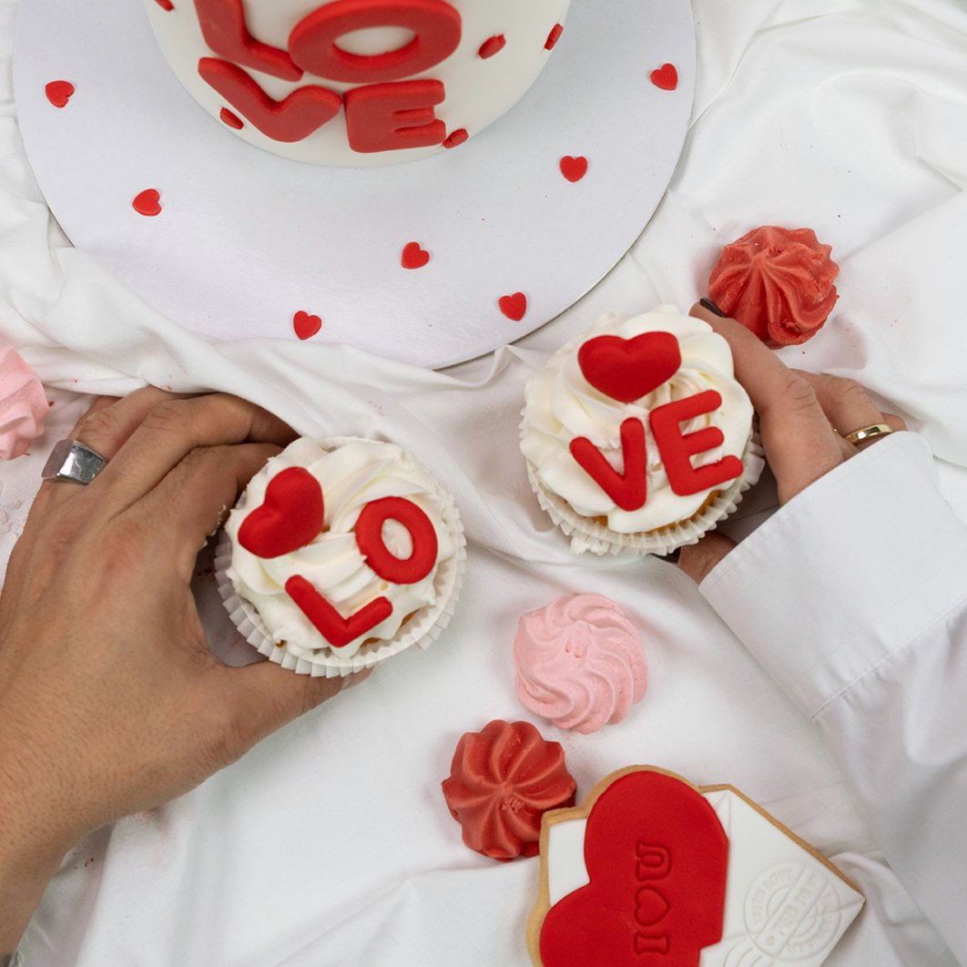 Η γέμιση του κέικ αποτελείται από μια απολαυστική κρέμα cookies με τραγανά κομματάκια μπισκότου, ενώ συνοδεύεται από δύο cupcakes βανίλιας γεμισμένα με πραλίνα και διακοσμημένα με την ίδια ερωτική διάθεση.