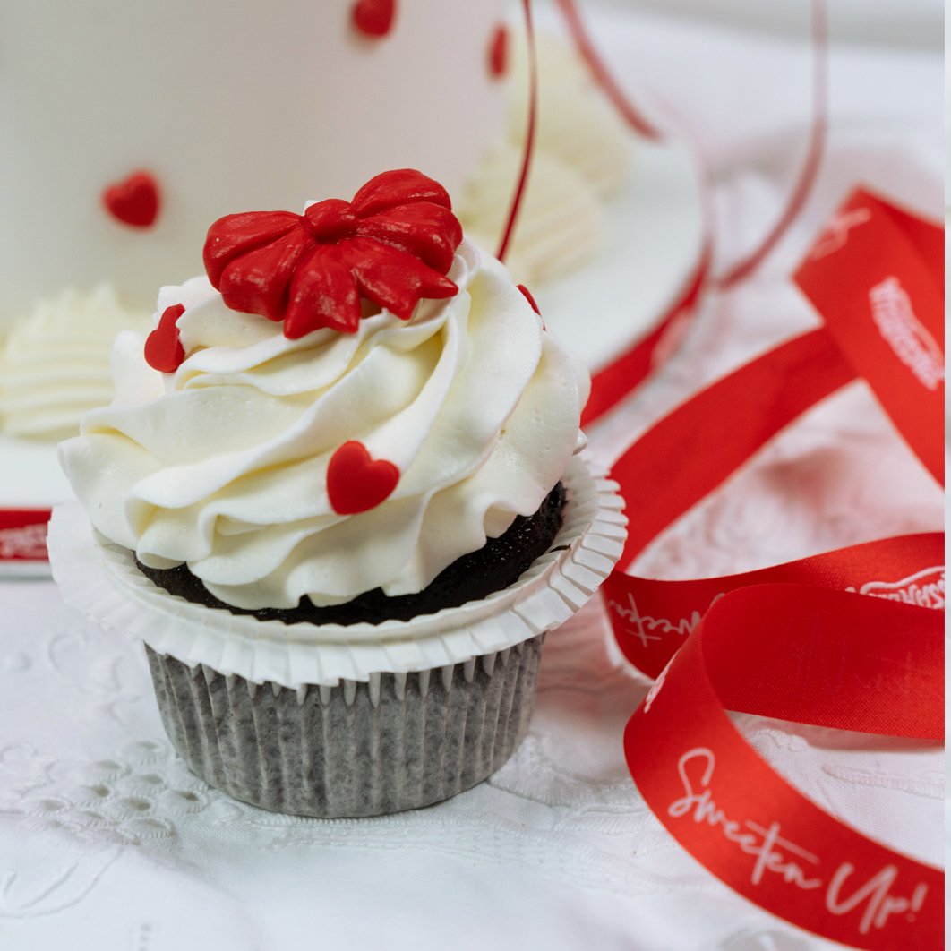 Η γέμιση της συνδυάζει απολαυστική κρέμα Choco και αφράτο κέικ σοκολάτας, προσφέροντας την τέλεια ισορροπία γεύσεων για τους λάτρεις της σοκολάτας. Οι κόκκινες κορδέλες προσδίδουν μία ρομαντική αίσθηση, ενώ η απόλαυση ολοκληρώνεται με δύο λαχταριστά σοκολατένια cupcakes γεμισμένα με πραλίνα.